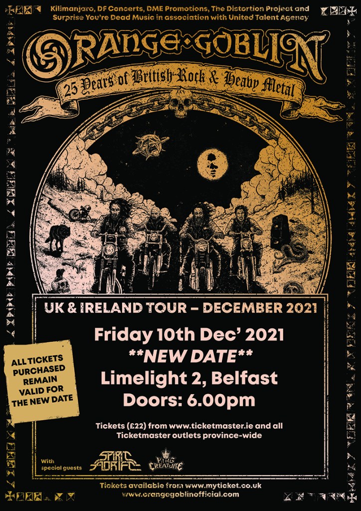 Unfortunately the Orange Goblin 25th anniversary show scheduled for December this year in Limelight Belfast 2 is now being put back to 2021. The new date for this one is *FRIDAY 10th DECEMBER 2021* Existing tickets purchased will be valid for the new date and are on sale now. Support comes from Spirit Adrift and KING CREATURE.